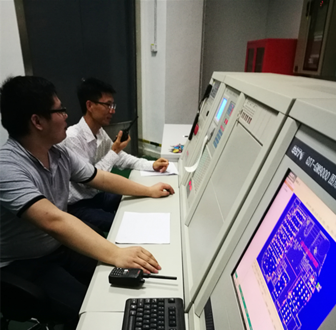 中控室发现2F- A1机房火警,派巡逻队人员察看现场并迅速疏散所有机房内人员,撤出A1机房,确保在气体灭火装置启动前机房内无任何人员。巡逻队员赶到现场确认,发现火情属实,火势较大,13名员工待撤离,迅速报告现场指挥,中控室操作人员确认消防控制器在自动允许状态。