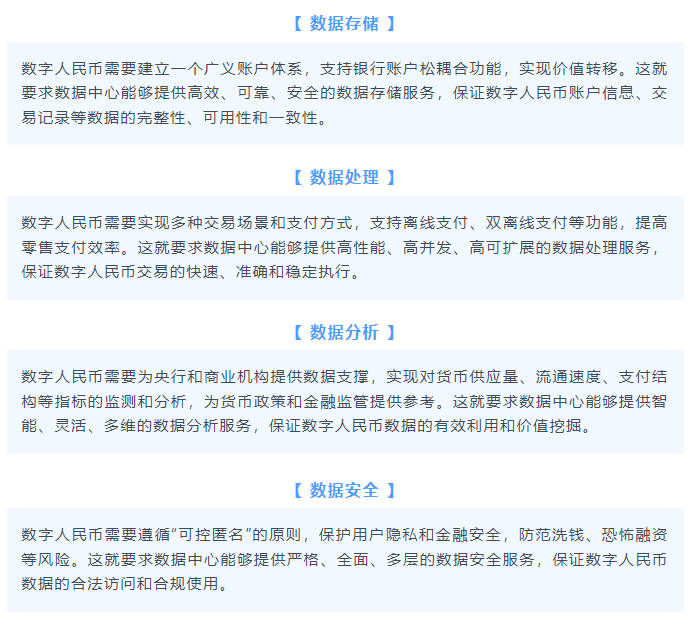 作为可能拥有十数亿用户的数字人民币来说,算力、存储、安全、稳定和高效运行,显然一样都不能少,对与承载其系统的数据中心要求也会很高。